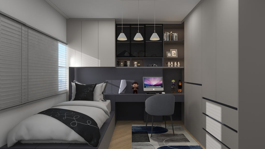 Built in wardrobes and shelves maximize space by removing the clutter. Dark tone provides to the space a feeling of being more spacious and elegant. Additional hidden storage was also installed to store other necessary items. The bedroom consists of a bed, study table, overhead cabinets, and wardrobes. The client wants to utilize the space while still being aesthetically pleasing to the eyes.