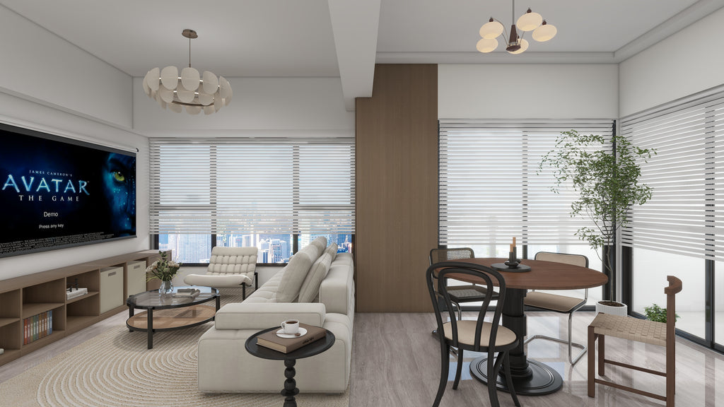 Living rooms are always the home's main attraction because people talk there. Therefore, it is essential to plan this space carefully. This condo connects the living area and dining area. The sofa becomes the divider of the two different areas. However, Dreamedhome can still connect these two areas, with the dining area serving as an additional seat for extra guests. Dreamedhome has customized the TV console. It includes storage areas for books, displays, and collections, a storage area for rattan baskets, and two drawers featuring skeleton line paneling.
