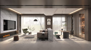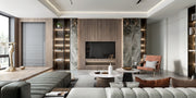 Modern light luxury deep wood TV cabinet, marble wall panel, hidden light strip to set off the atmosphere, the left grid shape, the right open grid for art display, with the background wall texture to form a luxury and comfortable echo, create a villa level space coherence.