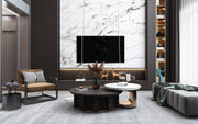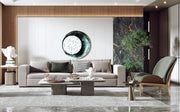 Modern natural wind fusion, light wood grille base + pure white panel to create a minimalist space, the central green circle clever embellish artistic atmosphere. The vertical texture of deep coffee marble strengthens the three-dimensional level, the cool and warm tones echo with the furniture, the velvet carpet texture lays a warm tone, and the whole achieves the triple aesthetic value of "light luxury texture × space permeability × visual focus".