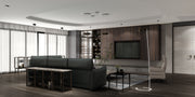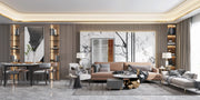 Wood grain base, imitation marble art backplane + metal lines, to achieve functional aesthetic integration. The stone texture of the background wall enhances the light luxury texture, the open lattice design of the side cabinet enhances the permeability of the space, and the wooden elements balance the cold sense, creating a composite scene of "storage - display - social", which has practical value and visual focusing effect.