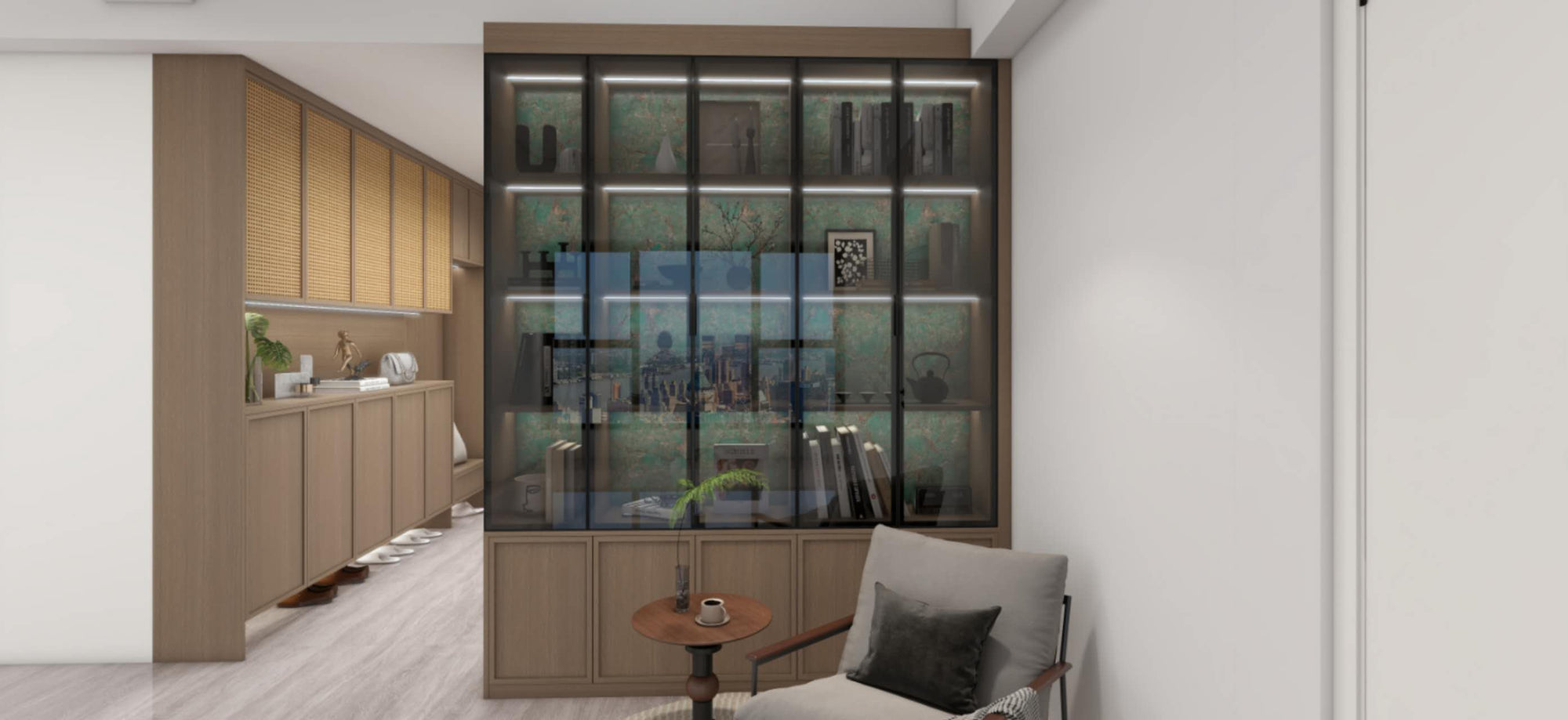 Stepping in here is like walking through a corridor of time. Antique design unique charm, walnut color shoe cabinet calm atmosphere, bone grain door and straw door match, retro warm; The side cabinet adopts milky white with bone grain door panel, fresh and elegant; Black frame grey bookcase fashion mystery; There are also open grid floor TV cabinets, can be placed rattan baskets, practical and add natural atmosphere.