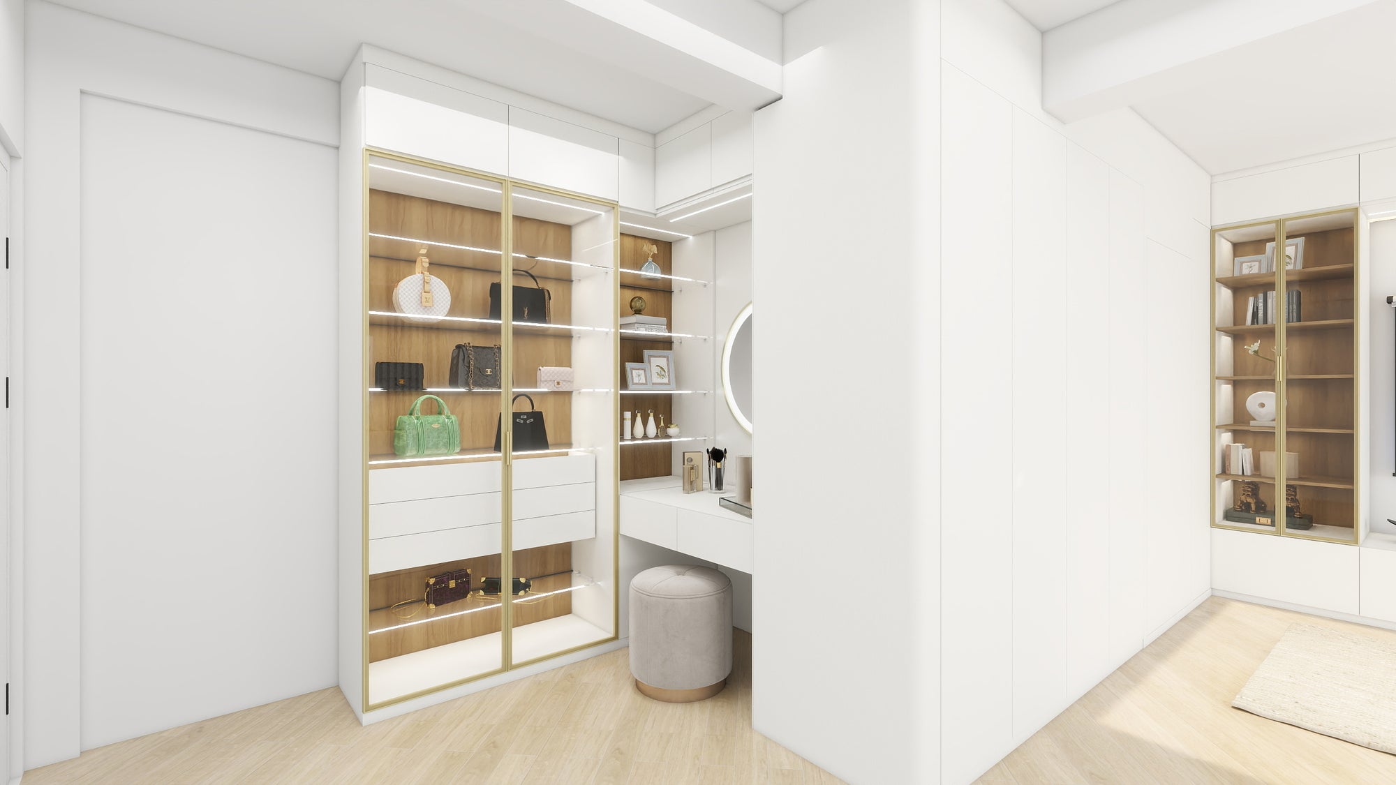 Stepping into this master bedroom is like falling into a princess's dream. The whole is laid out in a gentle cream white, and the champagne gold-framed glass cabinet door shines with elegant luster, exquisite and gorgeous. There is also the invisible door, which cleverly hides the cloakroom, and opening it is like opening its own fashion treasure space.
