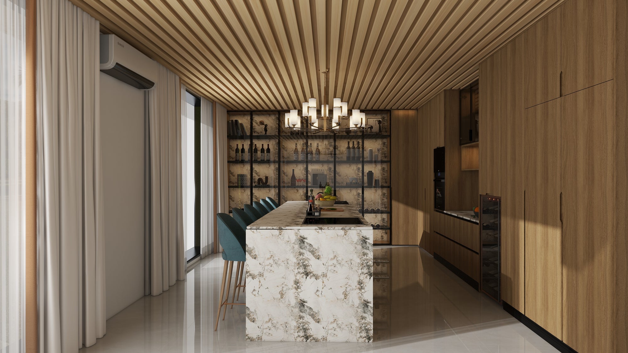 The two-story villa is dominated by cream white and wood tones, creating a warm and elegant atmosphere. The dining room and kitchen use grille ceiling to increase the sense of space layer; The restaurant's special invisible door leads to the nanny's room, which is both private and practical. Art backboard shoe cabinet design, highlight the unique taste. The master bedroom cloakroom adopts all-glass cabinet door, transparent and fashionable, showing exquisite life style.