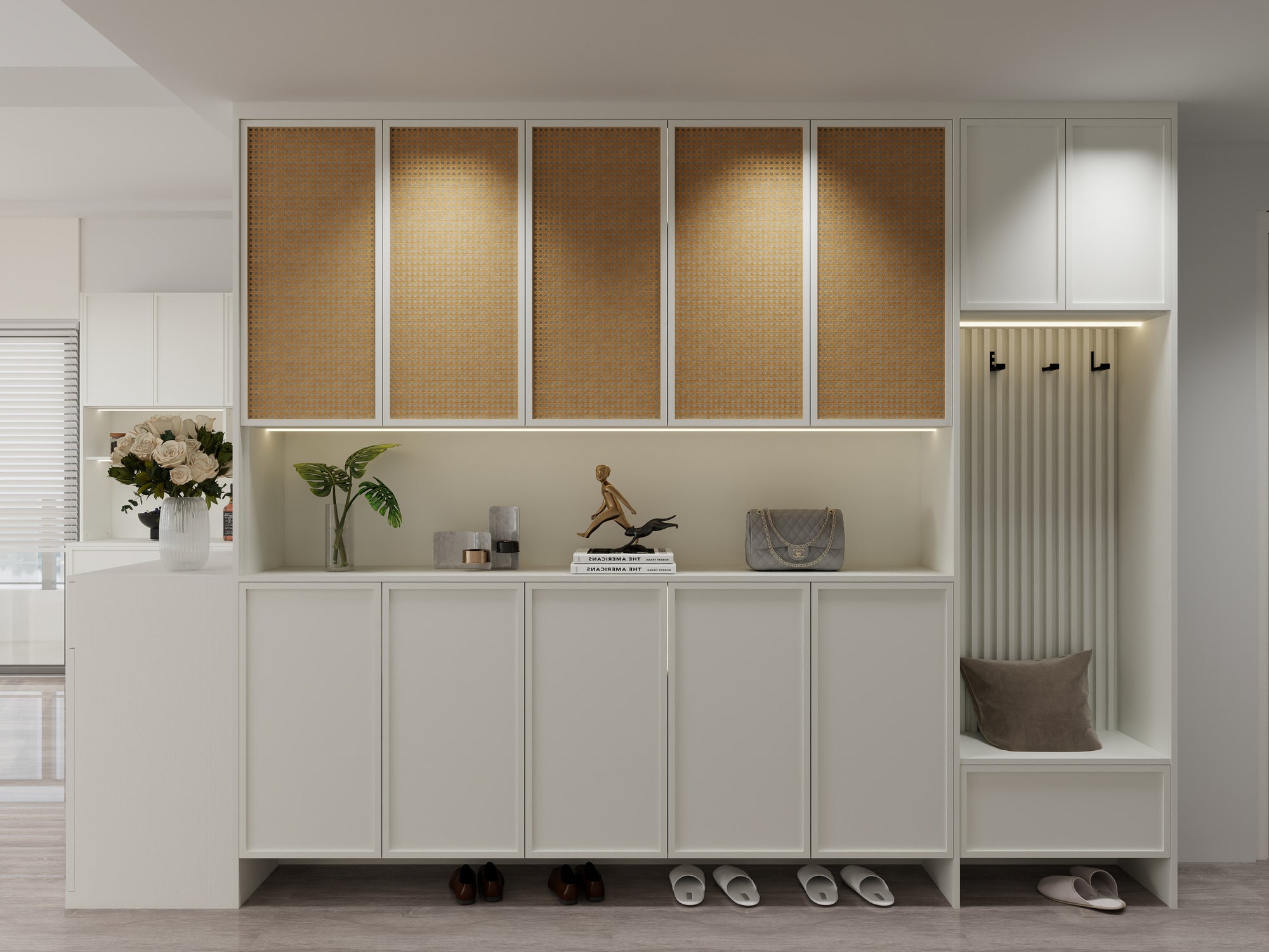 Stepping into this space, the milk white ancient design shows elegant taste. Shoe cabinet with bone line door and straw elements, unique charm; Changhong glass semi-transparent bookcase, creating a hazy sense of beauty; Milk white side cabinet and cabinet echo, the overall harmony and unity, every detail highlights the unique charm.